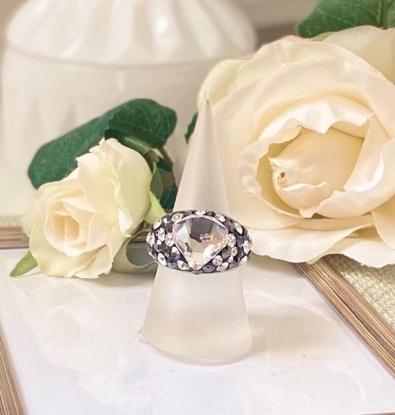 ダイヤモンドがモチーフのリング Color ブラックミックス 台はステンレス製。 スワロフスキーⓇ・クリスタルを材料としてハンドメイドした商品です。 サイズ 10号(内径16mm) 13号(内径17mm) 15号(内径17.7mm) 17号(内径18.4mm) 19号(内径19mm) オーダーメイドで作成いたしますので、 商品ご注文完了後のキャンセル・返品・交換はお受けできません。 何卒ご了承くださいませ。